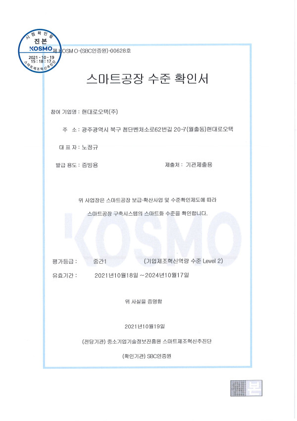 스마트공장 수준 확인서 > 인증서